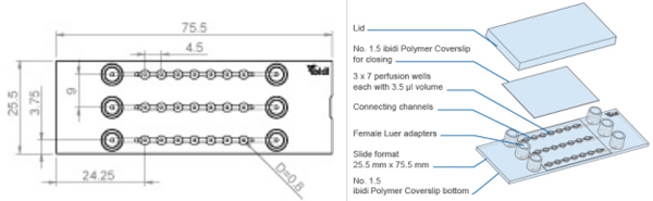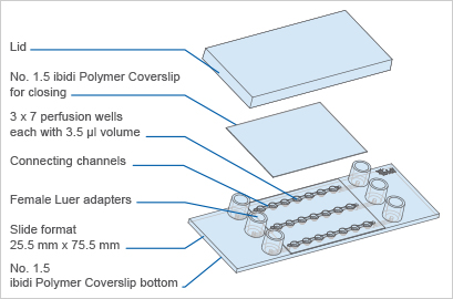 μ-Slide球體灌注是用于培養自由漂浮的3D聚集體的專用流動室。它由3 x 7平底孔組成,這些孔通過上方的通道連接。每個孔形成自己的壁,在此培養標本。